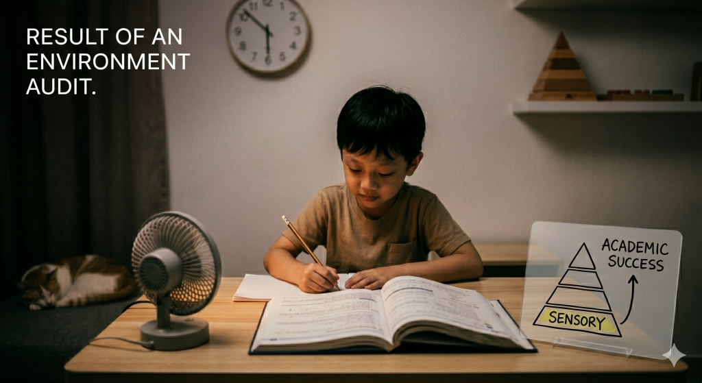 Tonight, try an Environment Audit. Identify just one “noisy” trigger — perhaps a loud fan, a flickering light, or a blaring TV — and turn it off during homework. You may find that when the environment stops attacking their senses, the “naughtiness” disappears on its own.